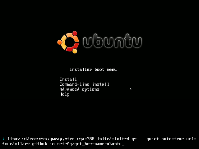 - 按下 Tab 鍵輸入 'auto=true url=fourdollars.github.io netcfg/get_hostname=ubuntu' 後按下 Enter 鍵